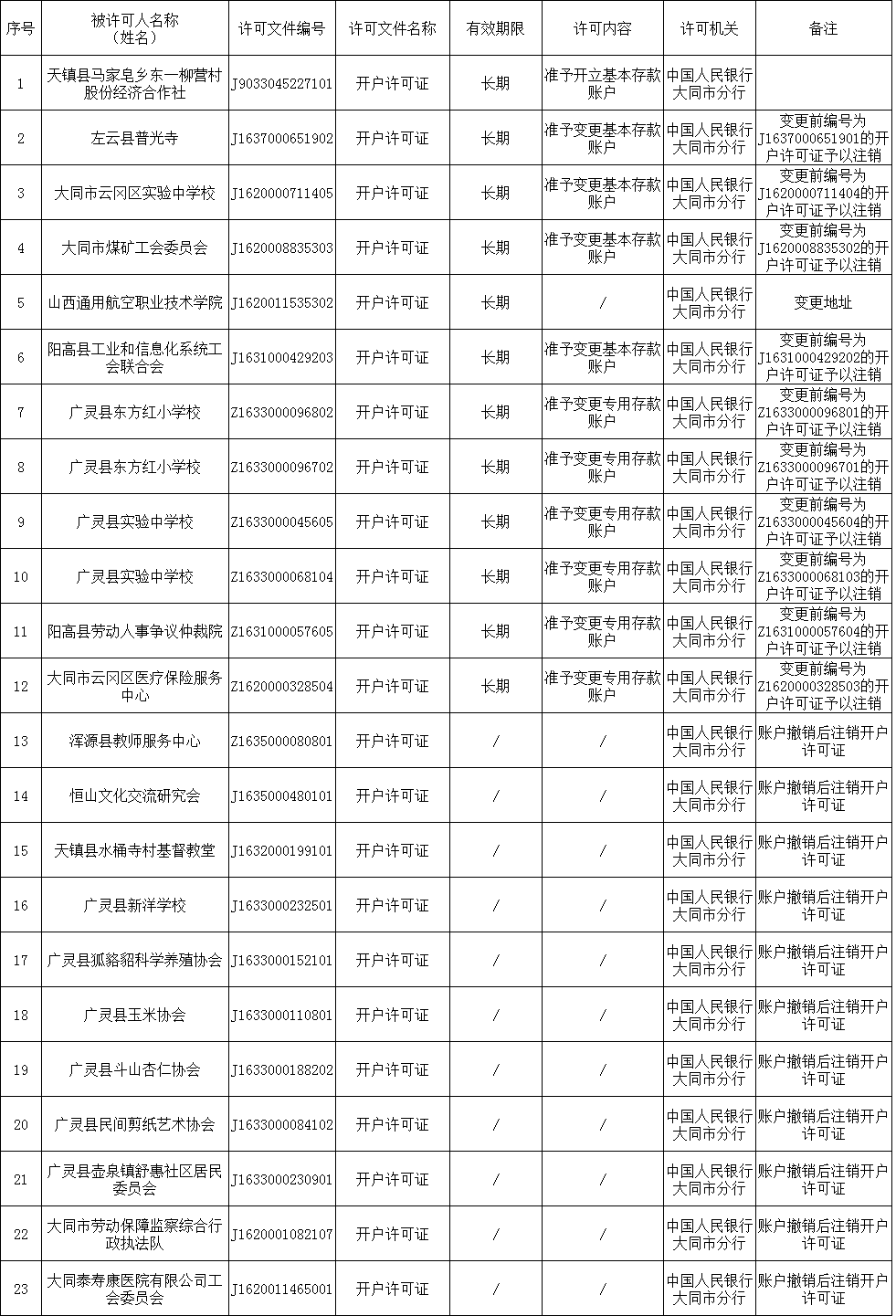 中国人民银行大同市分行银行账户业务许可决定信息公示表(2025年9月29日-2025年10月11日)