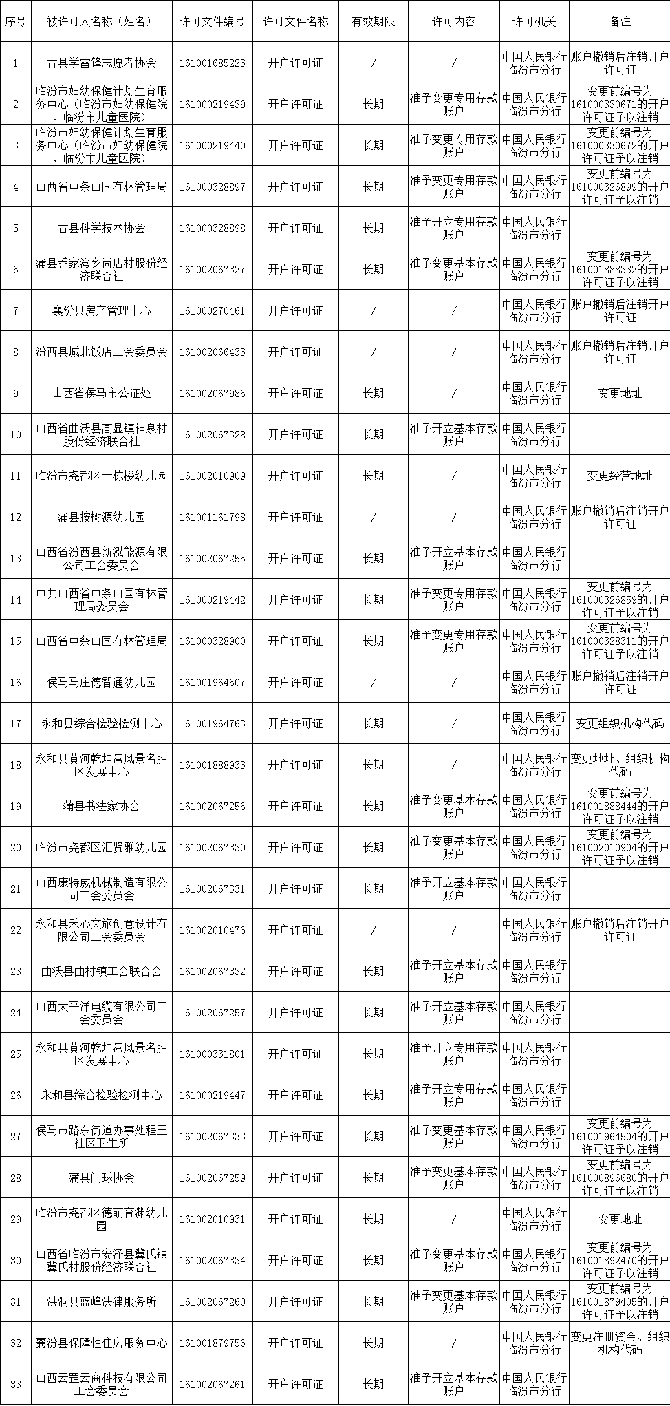 中国人民银行临汾市分行银行账户业务许可决定信息公示表(2025年8月11日-2025年8月15日)